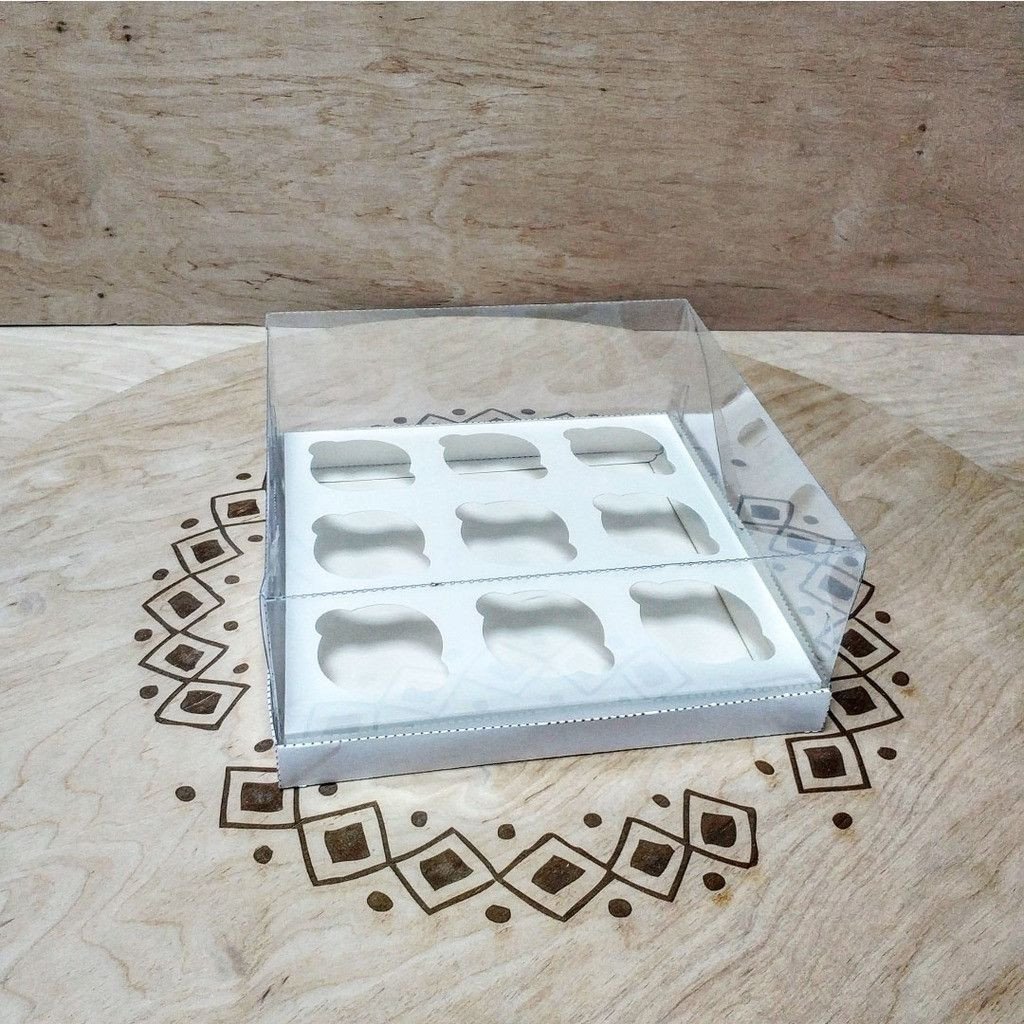 Материал и конструкция. ПЭТ 350 мкм. Стабильная складная конструкция с фиксирующими замками. Крышка прозрачная — изделие хорошо видно на витрине. Есть вкладка-разделитель на 9 ячейки — каждый десерт на своём месте, декор не соприкасается.